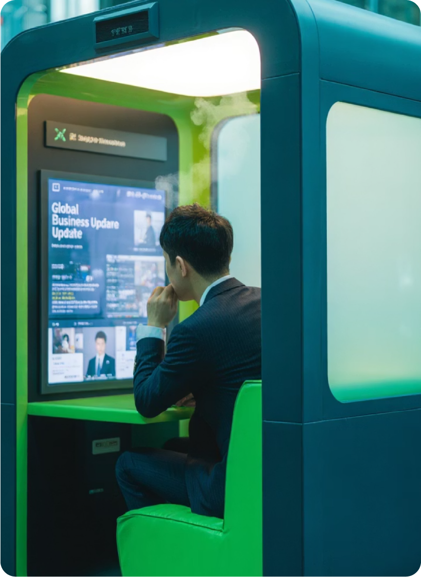 Metro Smoke Station+は、耐熱・防煙設計を施したボックス型または居室型の喫煙ブースです。木目調やグリーン素材を使用した美観設計により、都市景観との調和を図ります。最新のデジタルサイネージ技術を搭載し、情報発信プラットフォームとしての機能も備えています。